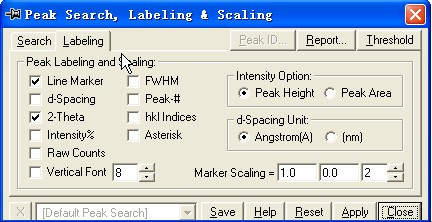 peaks,或右键单击快捷工具栏中的图标。出现一个悬浮框,在“search”里面可以对寻峰的判据进行设置,大家可以改动不同的限制条件,然后按 “apply”看看有什么变化。在“Label”里面主要是可以选定标注的内容,如d值,2 theta值,半峰宽,强度等,这些大家多试几次就OK了。如果要将寻峰结果列出,按下“report”即可。