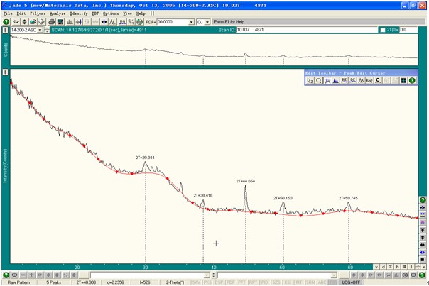 我以前用过专门的PDF软件做物相鉴定,但是感觉比较费神,最重要的是不能导入实验的衍射谱,除三强线外的其它谱线要靠人工去和标准谱一一对应,给准确判定带来不少困难。JADE在这方面还是蛮出色的,只需轻点鼠标,很快就能出结果,并且非常直观,易于判别,这主要得益于它具有强大的图谱处理综合功能以及先进的图谱鉴定方法,在此不作多讲,主要说说如何具体运用。