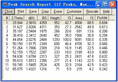 按下“report”直接查看结果,里面也有一些设置,如要修正的参数,晶粒大小计算的根据等,大家在实践中多试试,看看结果会有什么不同。在结果的列表中,选定复选框可以将该峰定义为背底,一行被选定(在图谱上该峰的标注线显示红色),按下“Erase”删除,其它栏目大家都比较熟悉,最后一项为晶粒大小的计算结果,要注意的是,这种晶粒大小的计算是建立在仪器的实际宽化曲线已存入的基础上的,否则就按默认的仪器曲线(软件自带),但不同仪器有不同的宽化曲线,因此最好自己建立,这也是仪器操作人员的事情,我就不多讲了,如果有朋友感兴趣,可以和我直接交流。再后面的事就是按下“export”进行保存了。