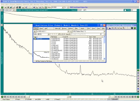 中间的窗口用于选择需打开文件,左侧选择文件路径与资源管理器的操作相同,右侧选择打开文件的类型,一般选择XRD Pattern files(*.*),这时在右下方的窗口中将显示左侧被选择文件夹中所有能被该软件识别的文件,然后选择需要分析的数据文件,点击菜单栏Read进入主窗口,此选择窗口可以通过主窗口中file/patterns进入。