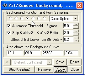 一张XRD图谱出来,往往因为有空气散射,漫散射,荧光以及样品结晶差等等原因而造成图谱上存在许多“毛刺”和较高的背底,虽然提高X光强度能成倍提高信噪比,然而有时受仪器和样品所限,这两项功能需要用到。但根据我个人的经验,要尽量少使用平滑和扣背底,因为这两项操作带来的可能后果就是将一些微弱的有用信息一概抹掉了,特别注意的是,如果将数据用来做Rietveld精修,更不要进行这两项操作。当然,如果是将图谱打印出来给别人看,适当进行平滑和扣背底也是个不错的选择。