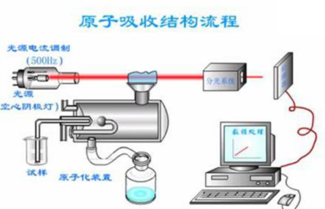 原理:原子吸收光谱分析的波长区域在近紫外区。其分析原理是将光源辐射出的待测元素的特征光谱通过样品的蒸汽中待测元素的基态原子所吸收,由发射光谱被减弱的程度,进而求得样品中待测元素的含量。