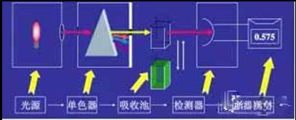 原理:分光光度计采用一个可以产生多个波长的光源,通过系列分光装置,从而产生特定波长的光源,光线透过测试的样品后,部分光线被吸收,计算样品的吸光值,从而转化成样品的浓度,吸光值与样品的浓度成正比。